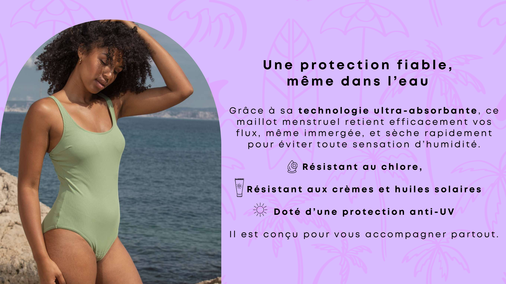 Maillot menstruel pour flux léger, moyen ou abondant, protection menstruelle écologique et zéro déchet, maillot réutilisable 5 à 10 ans, idéal pour baignade, natation, bronzage, hotel, sports nautiques, mer, ile maurice, mauritius, piscine et plage.